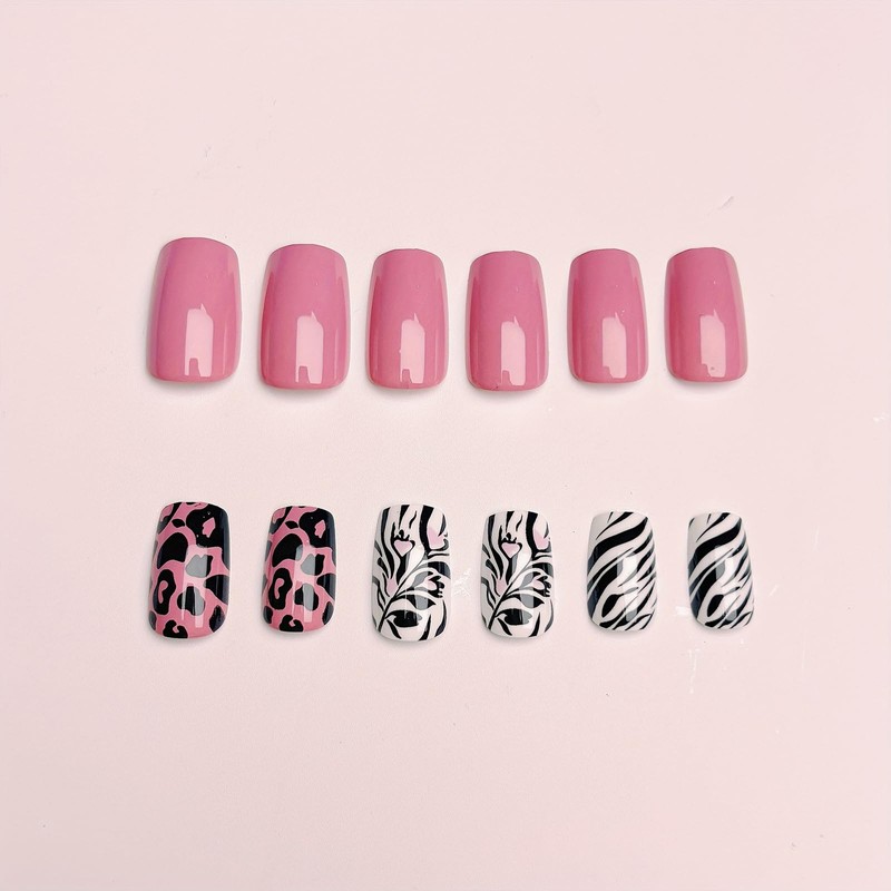 Leopard Press on Nails Medium Square Fake Nails with Designs Zebra Stripes Stick on Nail Pink Acrylic False Nail Glossy Artificial Nail Full Cover Glue on Nails for Women