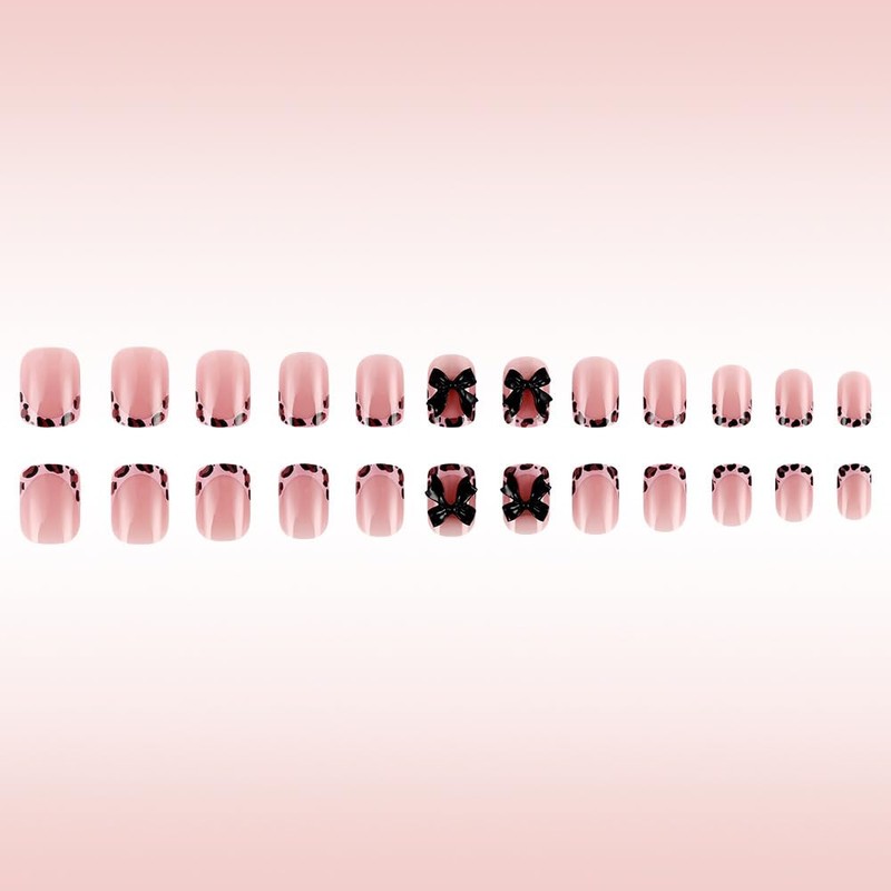 Leopard Press on Nails Short Square Fake Nails French Tip False Nails with Black Bow Nail Charms Cheetah Print Nails Press ons Reusable Acrylic Nails Full Cover Stick on Nails for Women Manicure 24Pcs