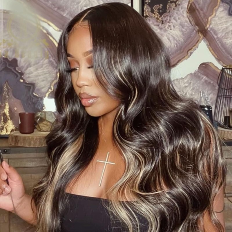 LEOSA Highlight V Part Wig Body Wave For Black Women Glueless Full Head Clip In Half Wig V Shape Wigs No Leave Out Upgrade U Part Wig Ombre Highlight Wig Body Parts for Women 24 Inch