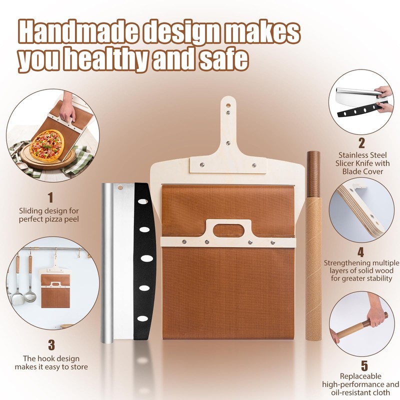• ?Effortlessly Transfer PizzaThe pizza peel is designed for easy sliding, With a subtle pull and push that ensures your pizza transfer slider maintains its flawless shape and the integrity of ingredients. Our innovative pizza slider paddle gives you a new experience. The package includes sliding pizza peel *1, pizza cutter *1, non-stick cloth *1.