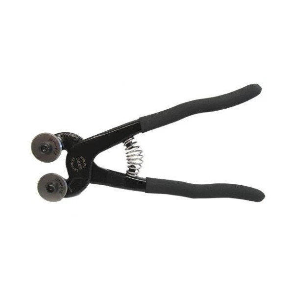 Cut the tiniest of pieces with amazing simplicity. One hand holds the glass & the other "cuts" with gentle scissor-like pressure. This tool can cut a varying thickness of glass from 1/32" to 1/4" with ease. Made with a long life carbide wheel jaw. Foam grip handles. • Carded for retail display, • Comes with allen wrench, • 7.5" x 1.5".
