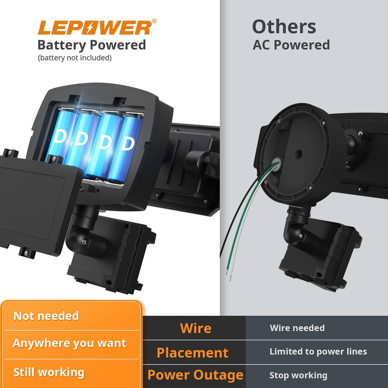 - Battery powered & Easy Installation: The wireless motion sensor light outdoor is suitable for areas where electricity and sunlight are not available. Motion security lights Outdoor is powered by 4 D batteries (not included) to provide bright illumination. Easy to install with a bag of accessories in 3 minutes, no main power or wiring or professional electrician required.