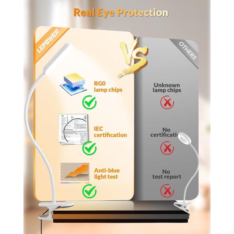 - True Eye-caring: 0 blue light hazard, no flicker, and high CRI≥93. Lepower book lights for reading takes care of your eyes during daily use and surely causes no eyestrain or fatigue
