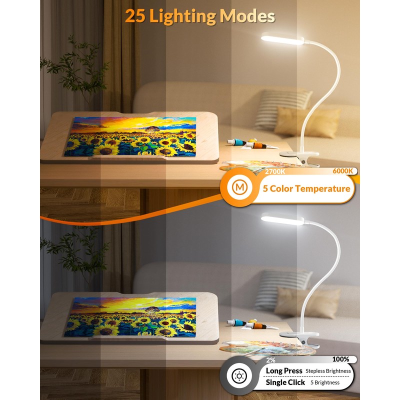 - 25+ Lighting Options: Offering Stepless dimming from 2%-100% and 5 color temperatures(2700-6000 K) to choose from, the max. 230 LM clip on light corresponds to your needs at ease