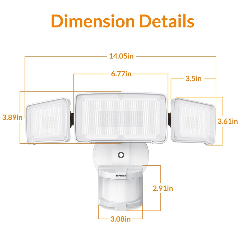 - Adjustable Design: You can adjust the 3 security light heads and motion sensor head to a different angle as your requirement. This outdoor motion security light can be installed for wall mounting by following a few wiring steps. When the security light is triggered, the lighting time is 10 s to 10 min (max)