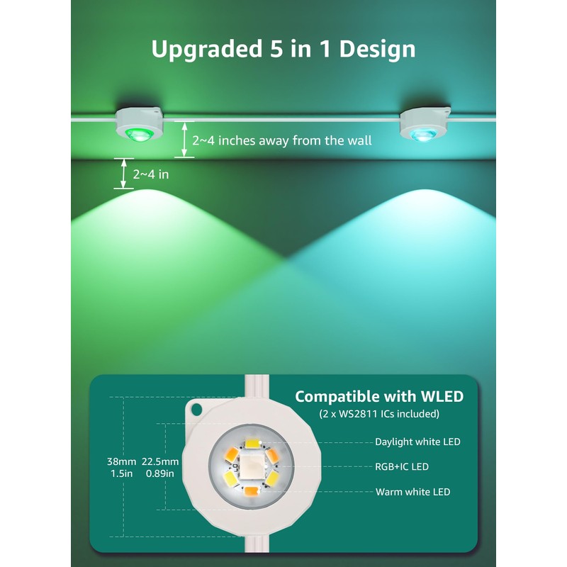 • [Upgraded Dedicated 2200K-6500K Tunable White Light] - Choose any shade of white light, from incandescent-like true warm white for accent lighting to daylight white for security lighting. The white LEDs are individually addressable, so you can set just some LED nodes to warm white while others remain off, or only light up every 5th or 6th light. (Note: dedicated white light cannot be used in combination with RGB colors due to the current firmware version. But you can also create patterns with mixed white light in the DIY-RGB page)