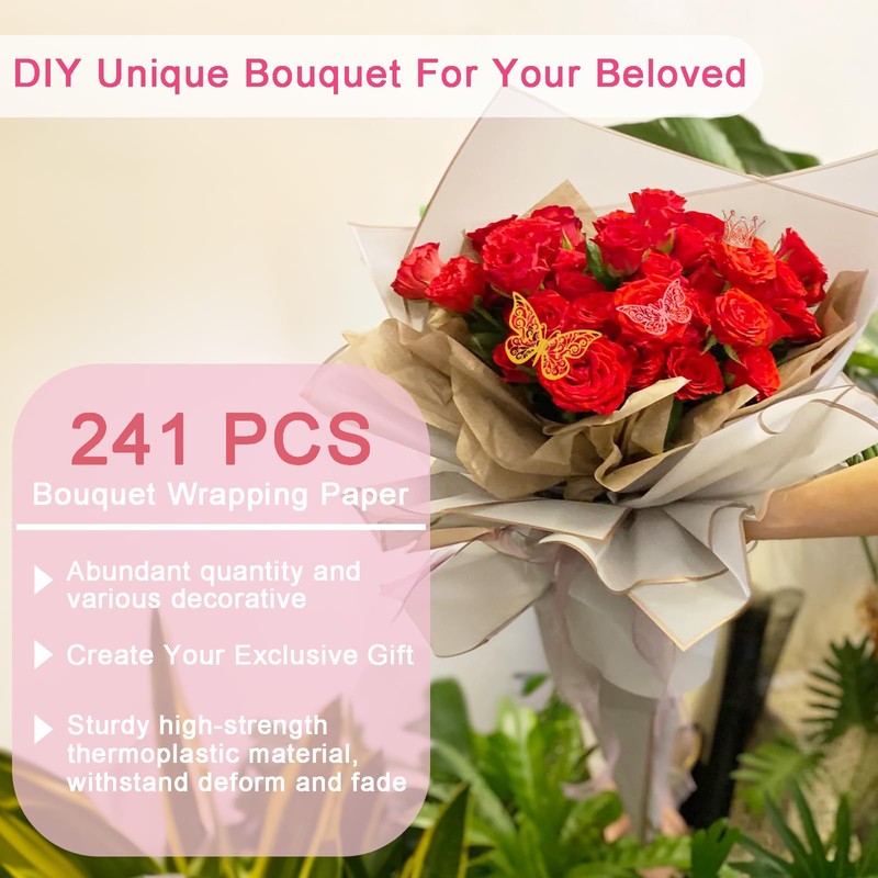 LePvo 241 Pcs Bouquet Wrapping Paper Set, Floral Wrapping Paper,DIY Craft Flower Wrapping Supplies with Various Size Butterfly, Crowns, Ribbons and Bouquet Pin, Gift For Wedding, Birthday, Party
