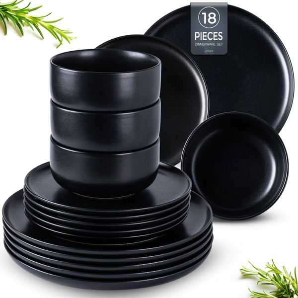 LERATIO Stoneware Dinnerware Sets for 6,Handcarft Ceramic Plates and Bowls Sets,Chip and Scratch Resistant Dishes, Dishwasher & Microwave Safe, Oven safe,Reactive Glaze-Black