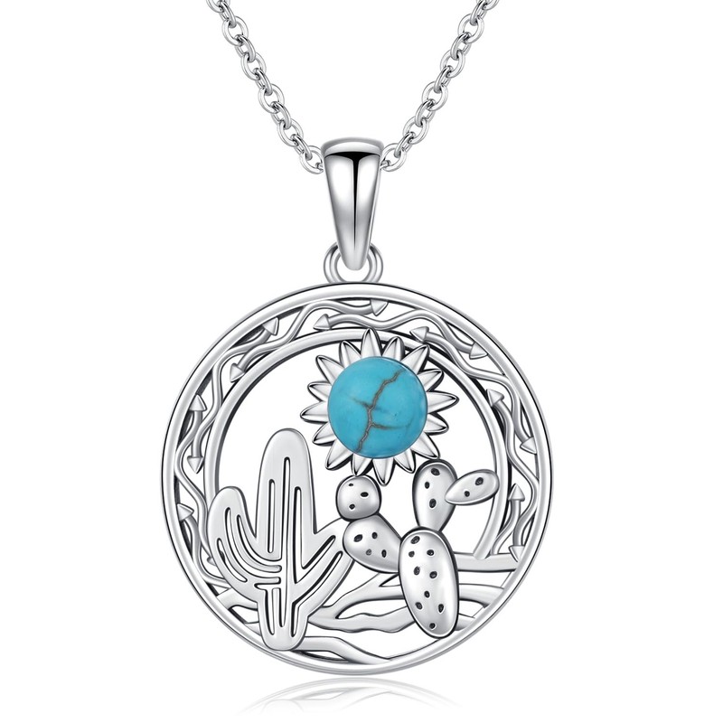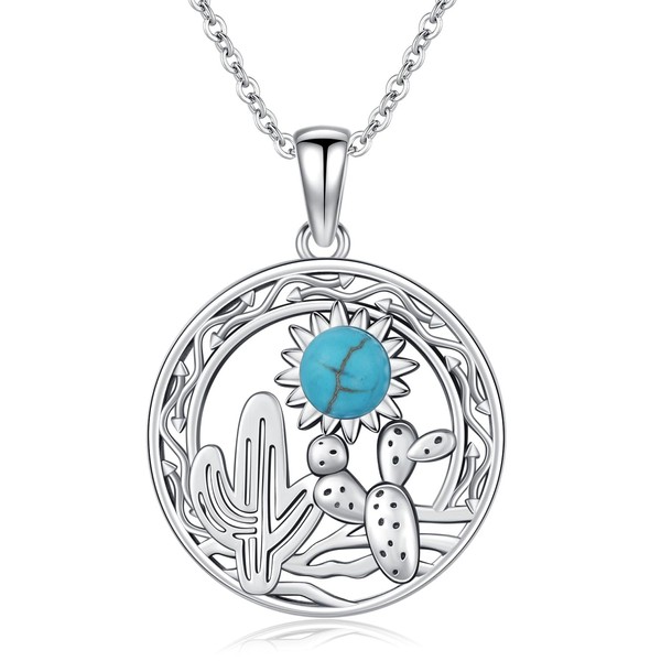 LES OSEWA Cactus Sun Necklace 925 Sterling Silver Turquoise Western Pendant Necklace Country Western Jewelry Cactus Gifts for Women Men