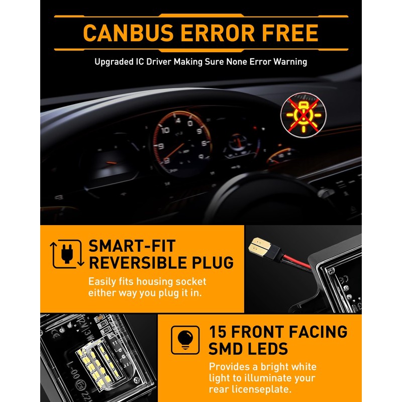 - [ Canbus Ready, Safer Driving] Upgraded IC driver can bring no canbus error. LESAUCE LED license plate light can fit for super duty without OBC error warnings, no interference with FM radio, reducing the possibility of pulled over for flashing lights
