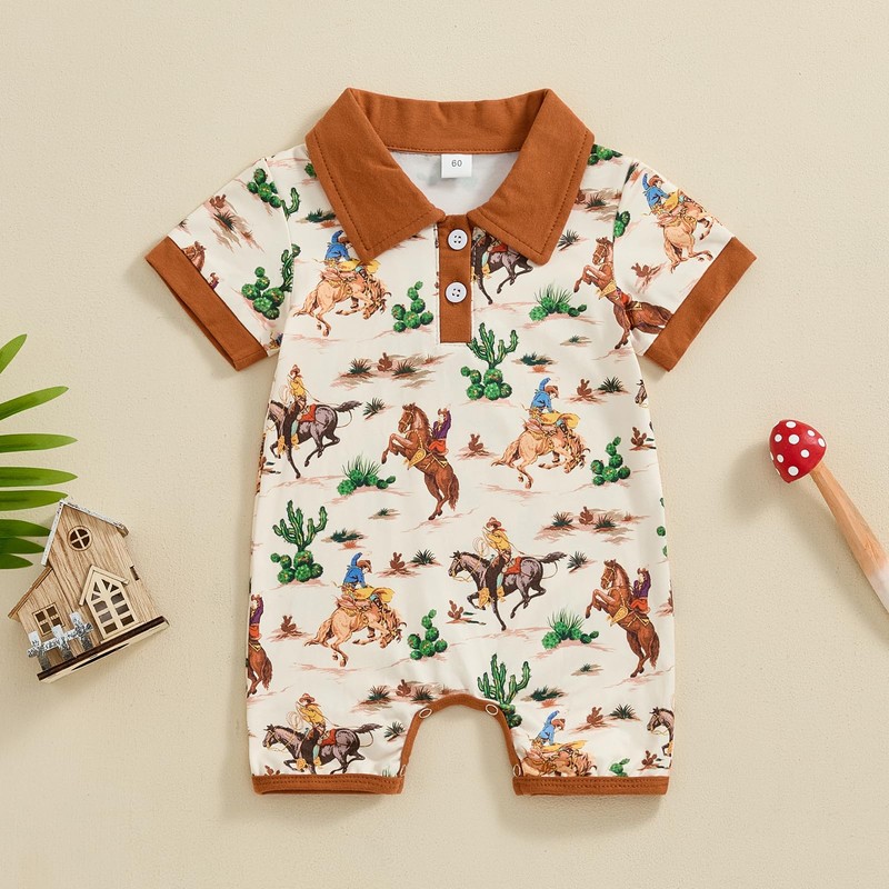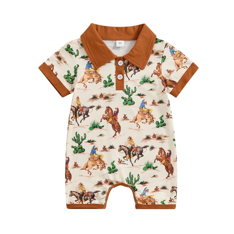 - PACKAGE INCLUDE: Newborn baby boy western outfit romper cow/horse print short sleeve button up collared romper jumpsuit bodysuit one piece outfit.Wash by hand or machine, air dry, not bleach.Didn't shrink and fade after washing.