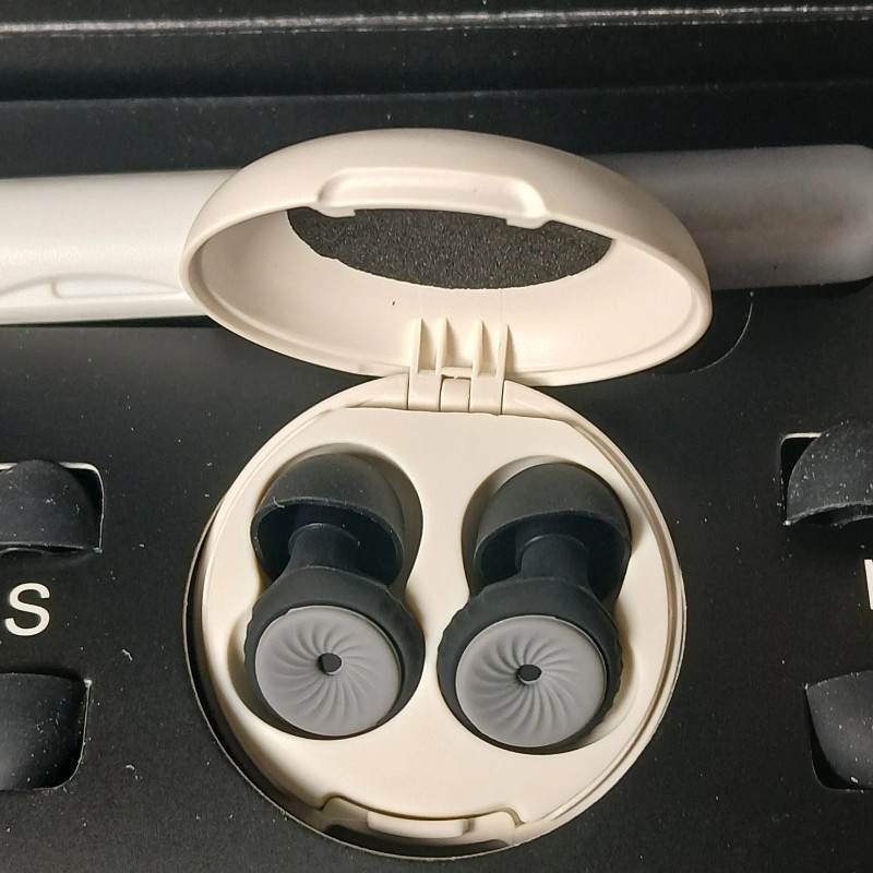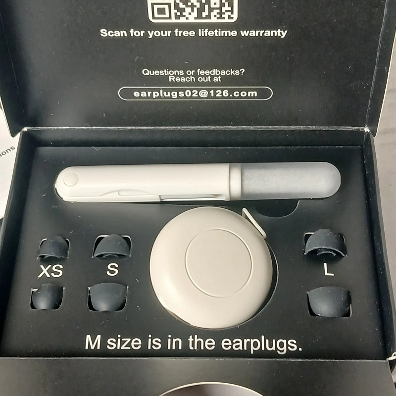 [What You'll Get?] Product: 1 set of earplugs, 1 white cleaning pen, 4 sets of silicone ear tips,size XS, S, M, and L ( M tips is already in the earplugs),1 portable keychain carry case.