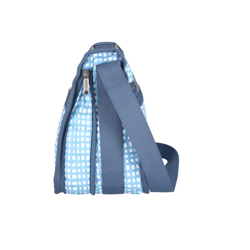 - LeSportsac Painterly Weave Deluxe Everyday Crossbody Bag + Cosmetic Bag, Style 7507/Color E612, Dreamy Sky Blue & Crisp White Unite, Abstract Playful Gingham Inspired Weave, Subtle Pearlized Sheen