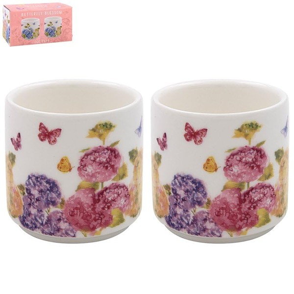 LESSER & PAVEY 2pc Ceramic Boiled Egg Cups Server Holder Fine China Butterfly Blossom Floral