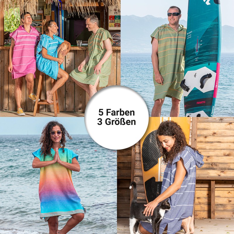 - Stylish and multifunctional: our changing cape offers more than just one function. Use it as a hooded towel, changing room or as an airy towel dress that protects with its hood from cool wind, eyes and also from the sun, while guaranteeing maximum freedom of movement. The almost knee-length loose cut and the variety of colours make the bath poncho a trendy must-have beach accessory.