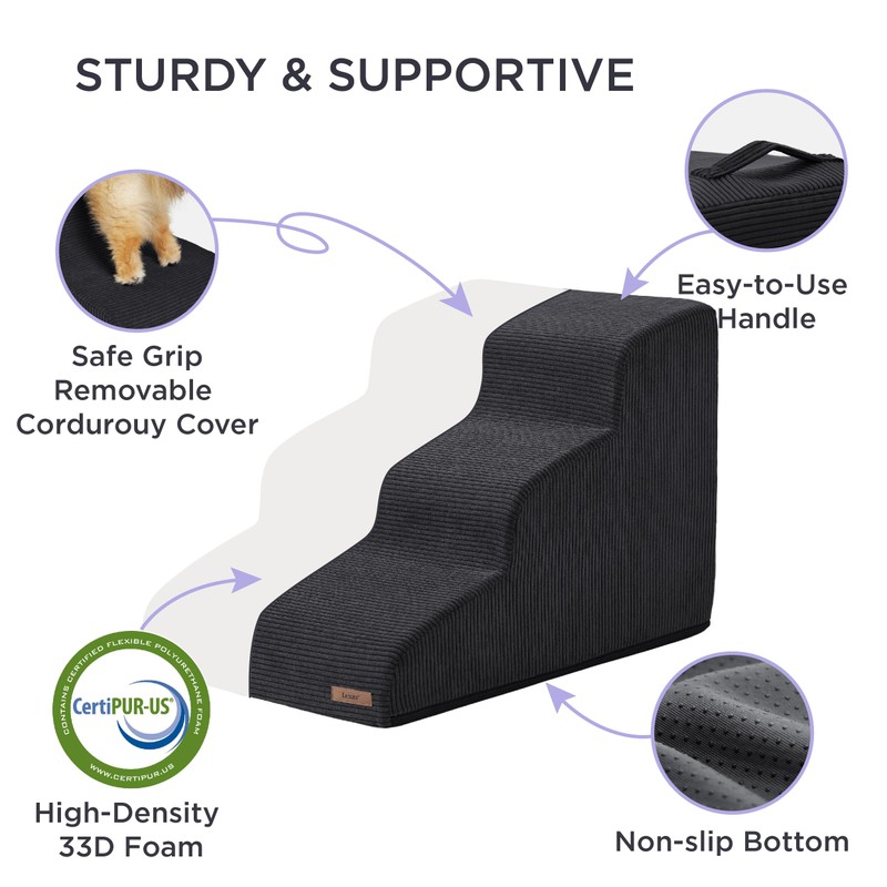 - Durable & Sturdy: These pet ramp stairs feature strong and reliable 33D high-density, lightweight foam, ensuring a robust build that's easy to move while providing stable support for cats and small/medium-sized dogs. The non-slip corduroy pet stair cover adds extra stability, ensuring your pet's safety and preventing any mishaps as they navigate up and down.
