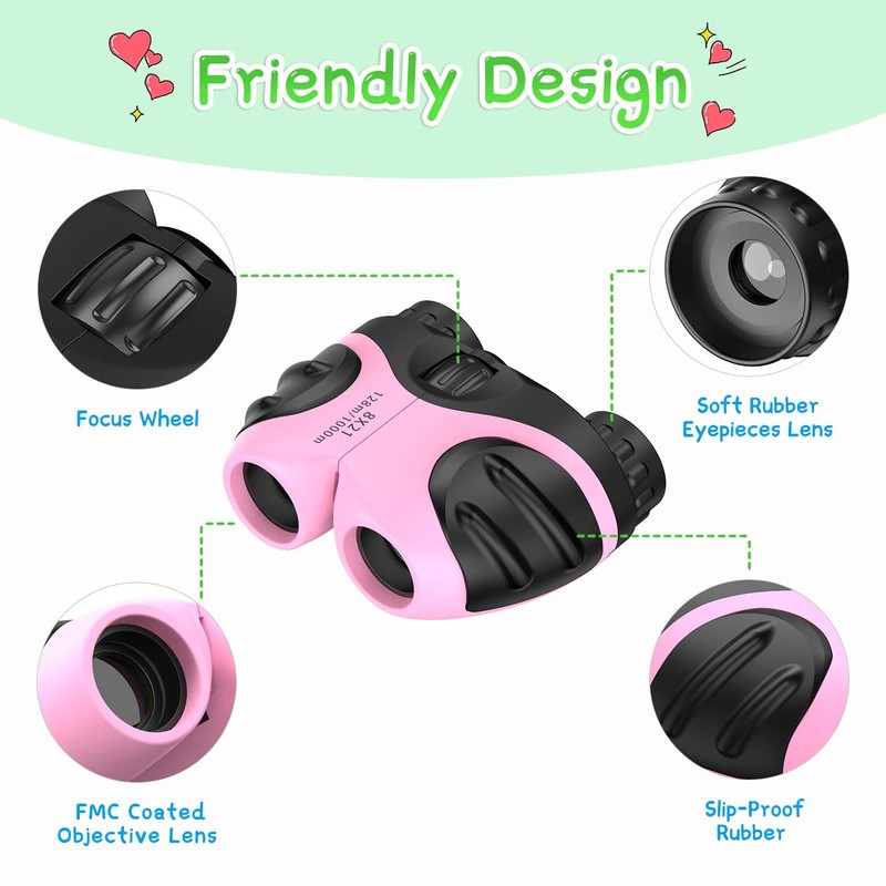 - Real Binoculars for Kids: This product has a super magnification of 8X with an amazing view. The binoculars can be adjusted to easily match the eye distance gap for each child. Great for bird watching, learning, hunting, theaters, boat rides, hiking, traveling and enjoying the wilderness!