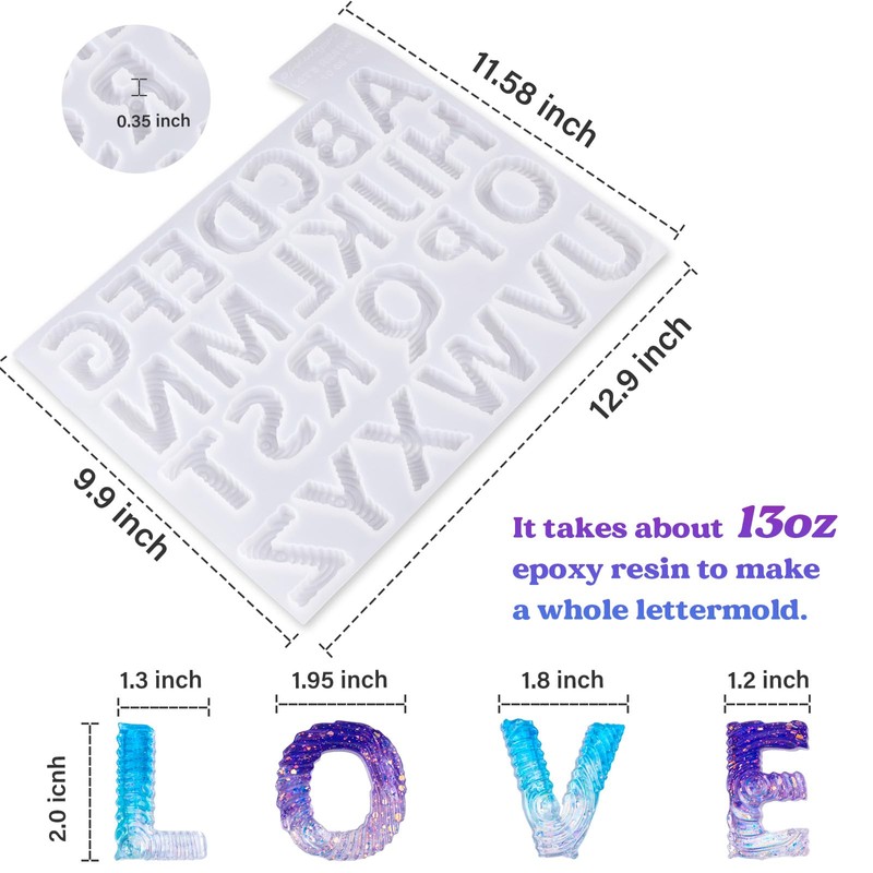 - Upgraded Large Resin Letter Molds - A departure from conventional alphabet molds! We've boosted the size and thickness for enhanced versatility. With a finished letter thickness of around 0.35 inches, the possibilities are endless. Create striking 3D self-standing tabletop signs or craft personalized keychains and more. Elevate your resin art game with these molds that offer boundless creative potential.