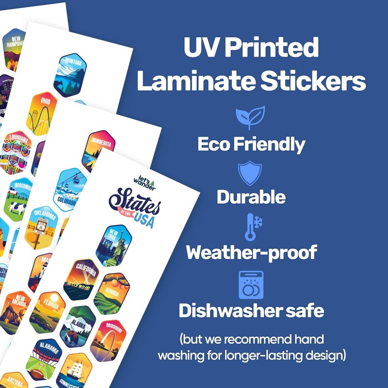 - Weatherproof & Waterproof Stickers - America offer a diverse weather because of its geography, regardless of states you visits, you don't have to worry about the quality of our hand-designed stickers, because they're snag-resistant and made to endure America's diverse weather