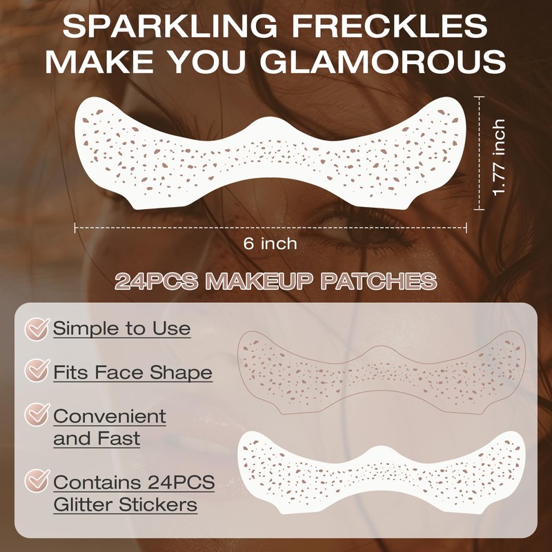 - 【Easy to Apply & Remove 】Remove the backing clear sheet by peeling it off;Apply the sticky side to your skin;Wet it,and Peel to reveal instant glam in seconds.Easy to get off with some makeup remover (oil).These sparkle freckles patches come off just like regular makeup,with no extra hassle