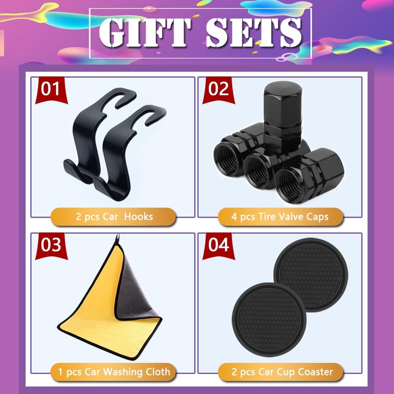 • Gifts: 2 pcs of coasters valued at 4.99, 4 pcs tire valve stem caps valued at 4.99, 1 car wash towels valued at 3.99, 2 pcs car back seat headrest hooks valued at 3.99 .