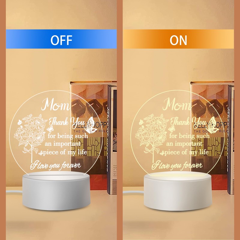 - Gifts for Mother: This acrylic night light engraved with "Mom thank you for being such an important piece of my life. Love you forever." witch fully express your love and encouragement for your Mom/wife.