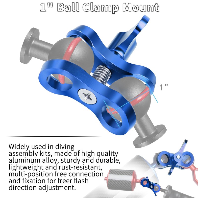 - 【360° Rotation】The ball clamp mount allows for 360-degree rotation, making it easy to connect a fill light, flashlight, arm, float tube or action camera, providing a versatile underwater photography experience
