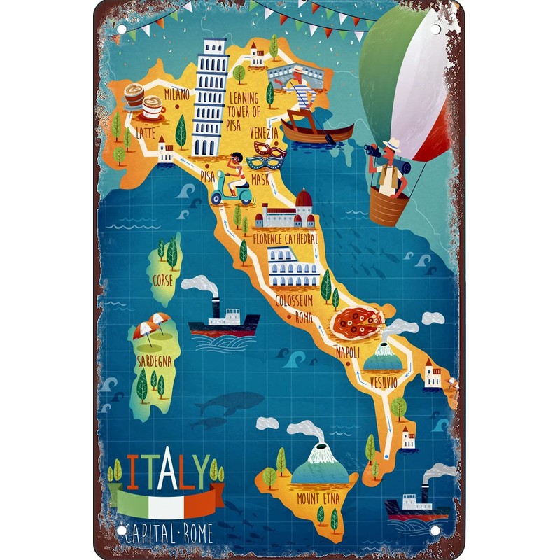 Letrero decorativo retro de metal de 8 x 12 pulgadas con diseño de mapa de Italia para habitación, decoración de pared, bar retro de viaje del mundo