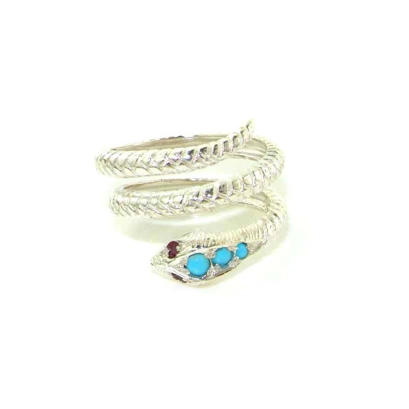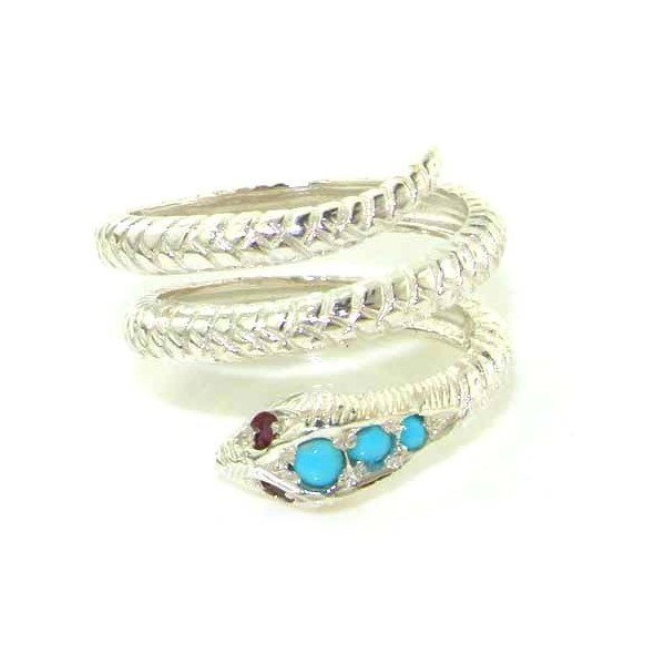 LetsBuyGold Solid Sterling Silver Natural Turquoise & Ruby Detailed Snake Ring - Size 8.25