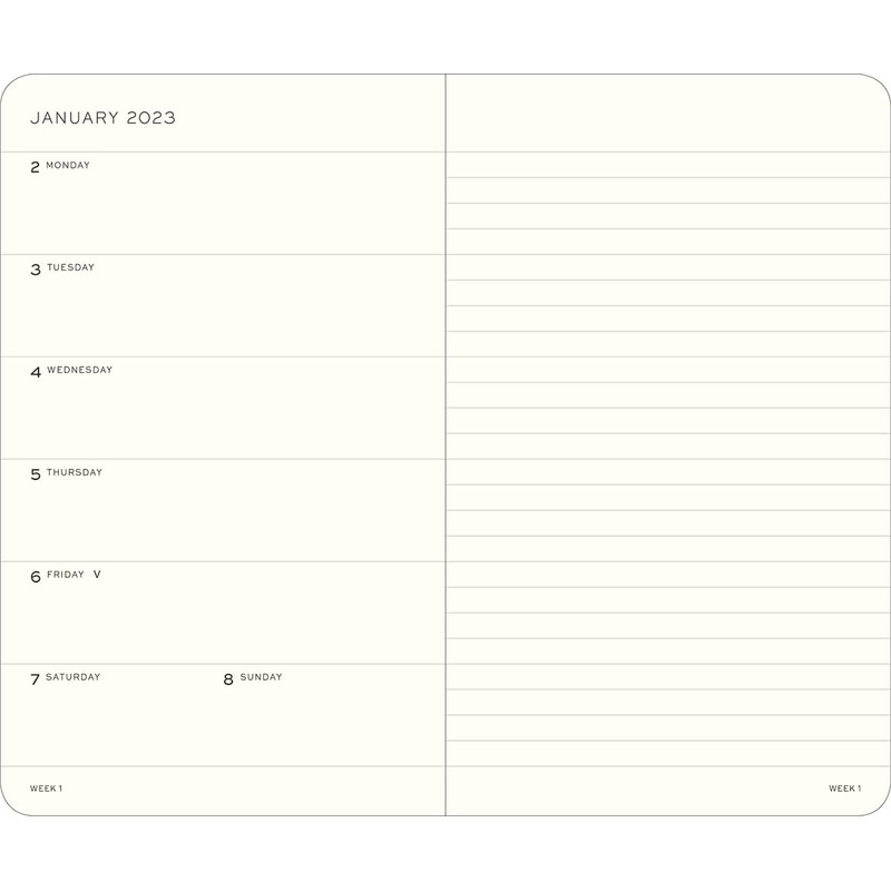 - Each double page has one page with the calendar week on the left and a lined notebook page on the right.