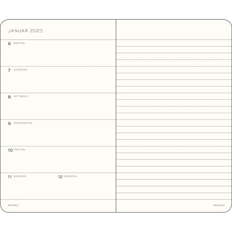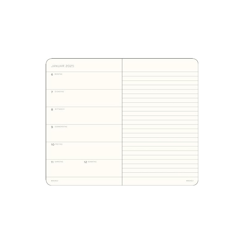 - Easy organisation: Calendar and notebook in one, for 01 January – 31 December 2025. The layout features the calendar week on the left and a lined page for notes on the right. Ideal for birthdays, work, university and leisure.