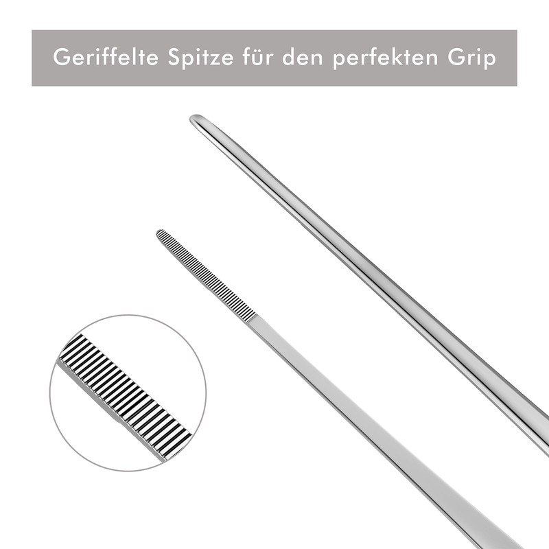 - ✔ Dishwasher safe – The stainless steel cooking tweezers 30 cm can be easily cleaned thoroughly under warm water. Of course, the kitchen tweezers are also dishwasher safe.