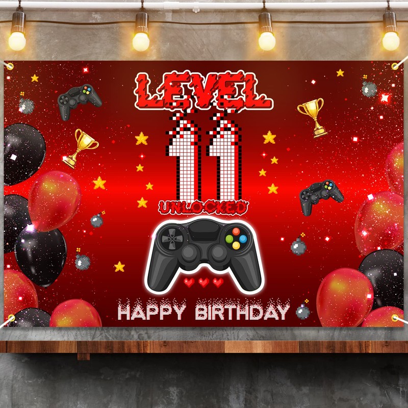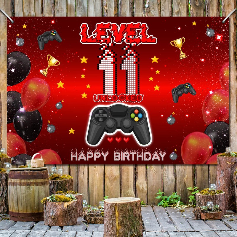 Level 11 Unlocked Backdrop Banner Decorations Video Game On Happy 11th Birthday for Boys Kids Red and Black 11 Years Old Level Up Theme Bday Background Photography Party Decor Sign Supplies