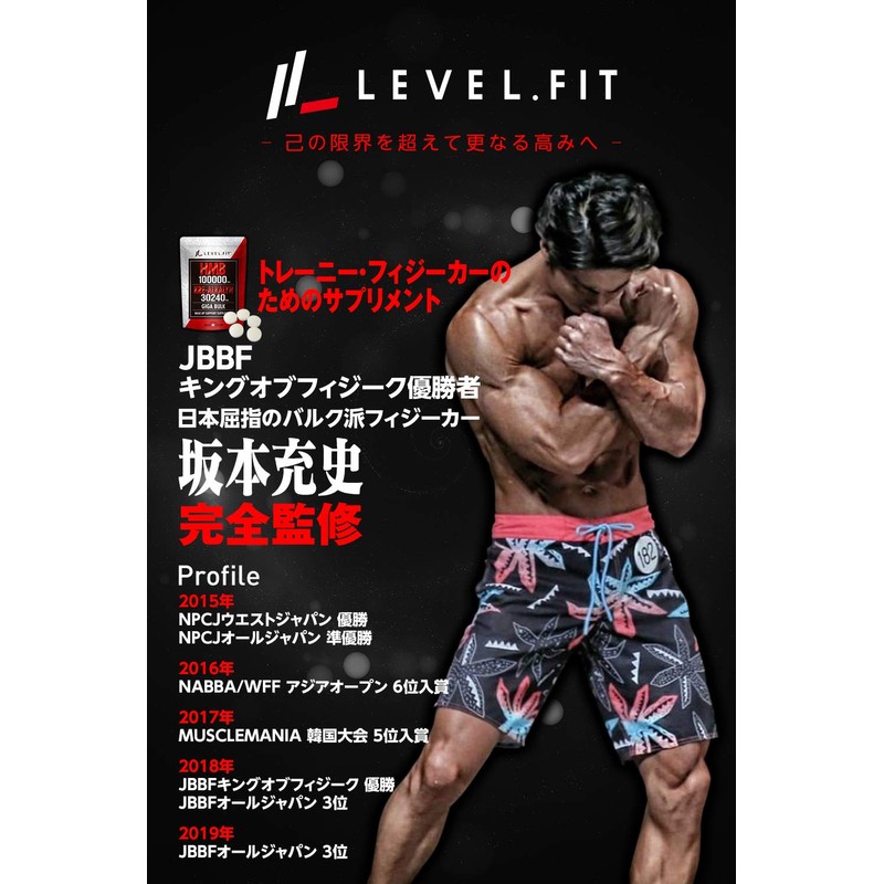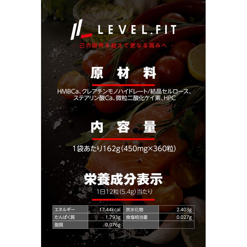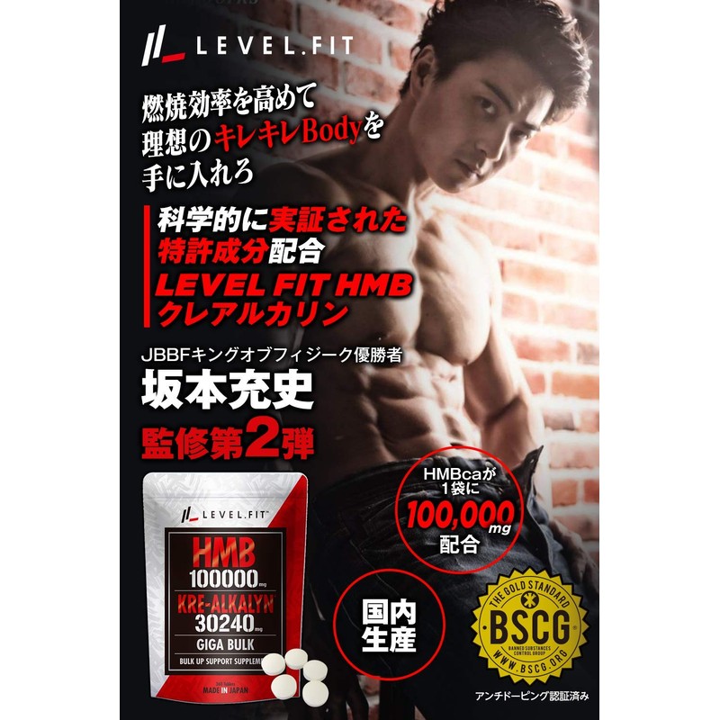 - ・商品名:LEVELFIT HMB クレアルカリンサプリ 名称:HMBca含有加工食品 原材料:HMBca、クレアチンモノハイトレード/結晶セルロース、ステアリン酸Ca、微粒二酸化ケイ素、HPC、162g(450mg×360粒)保存方法:高温多湿、直射日光を避け、涼しいところで保存してください。 【お召し上がり方】栄養補助食品として1日12粒を目安に水またはぬるま湯とともにお召し上がりください。【栄養成分表示】1日12粒(5.4g)あたり エネルギー17.44kcal たんぱく質1.793g 脂質0.076g 炭水化物2.403g 食塩相当量0.027g 1粒あたり1.45kcal 坂本充史氏おすすめの飲むタイミング:トレーニング前後2回(1回6粒ずつ)もしくはトレーニング前(1回12粒)
