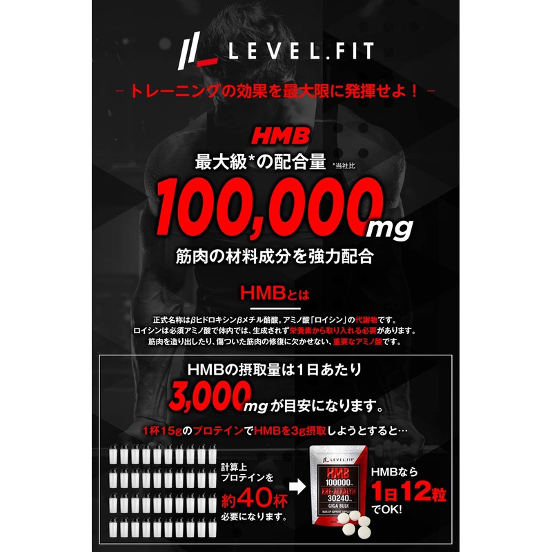 - (業界最大級の配合量)HMB100000mg(1袋)HMB1日必要目安量3000mgを超えた配合量 1日分(12粒)3333mg(30日換算)配合。