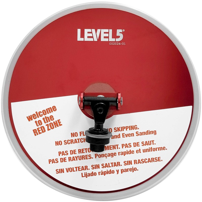 The LEVEL5 grinding head is constructed of premium anodized aluminum for lightweight durability, and the outer edge features a rubber buffer to protect adjacent walls while sanding tight corners. The grinding head comes with a universal adapter to attach to the LEVEL5 48" Aluminum Grinding Rod (SKU# 5-343) or any other ACME threaded sanding rod. It is also compatible with all 9 inch sanding discs that use the Velcro attachment method.