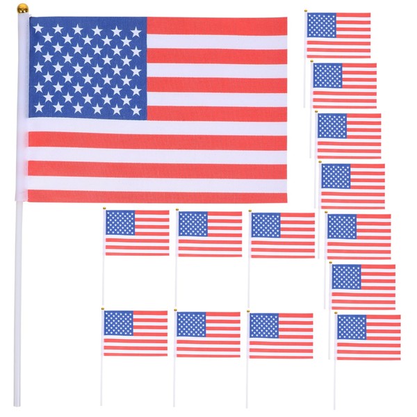 mini flags - Material: Polyester.American US Flags on Stick - Made of polyester material for durable using.US flags Features - Color: As shown.Mini US Flag 14 x 21 cm.mini american flag The item is mini US hand waving flag made of polyester.Mini American Flag on Stick - Portable and lightweight, won't take up too much space in your bag.Small American Flag It is very waving it at 4th of July or other festive activity.americans flags - workmanship with smooth stiching.american flag Bring much more fun and festive environment for your friends.usa flags on stick - Size: Approx.american flags - 4th of July decoration and any patriotic events!- Double side osmotic effect, washable and hard to fade.mini american flags Antique gold at the top, flag comes on a plastic stick