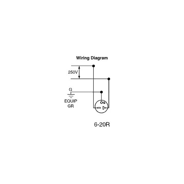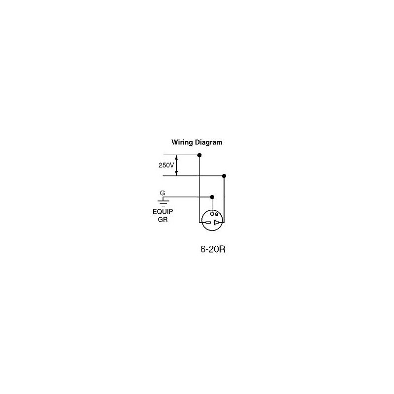 This receptacle has a NEMA 6-20R configuration with a voltage rating of 250 VAC and an amperage rating of 20 A. It is designed to operate in a temperature range from -40 to 60 degrees Celsius.