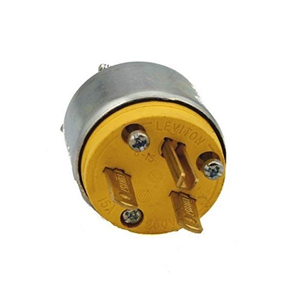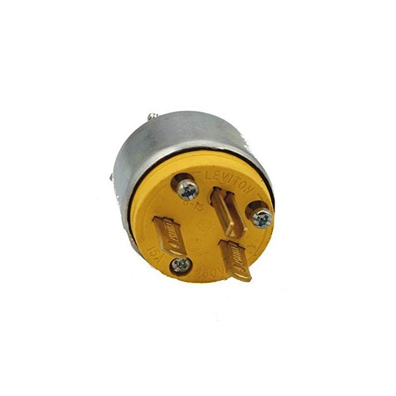 Leviton Electric Plug, Straight Blade, 2 Poles, 3 Wires, 12 - 3 AWG Wire, 15 A, 250 V, Nema 6-15P, Armored Grounding, PVC/Steel, Yellow, CSA Certified, UL Listed, For Commercial Applications. Triple-drive heady screws - Standard, Phillips, Robertson|NEMA configuration number & rating molded on face of device for easy identification|Deep-slotted, backed out terminal screws draw back wire clamps securely for maximum conductivity Husk & module keyed for easy alignment during wiring Built-in cord grip adjusts automatically for use with No. 18-3 through No. 12-3 cords. Features. Amp - 15. Volts - 250. 2 pole 3 wire. For up to 12 wire.