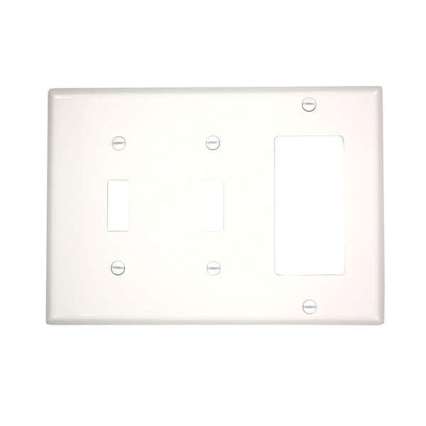 Leviton combination wallplates come in a variety of configurations and gangs, and are available in a broad selection of materials including, aluminum, brass, stainless steel and plastic, and in an assortment of colors. If you have a unique application, Leviton can also customize a wallplate for a specific job. 3-Gang 2-Toggle 1-Decora brand/GFCI device combination wallplate, standard size, Thermoplastic nylon, device mount, white.