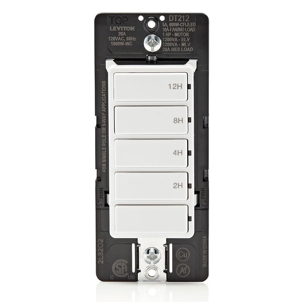 Leviton Countdown Switch for Lights, attic, heaters, Pool Pumps, 2-4-8-12 Hour, Neutral Wire Required, 20A, 1 HP/16A Fan/Motor, Single Pole, Multi-Way or Multi-Timer, DT212-1LW, White