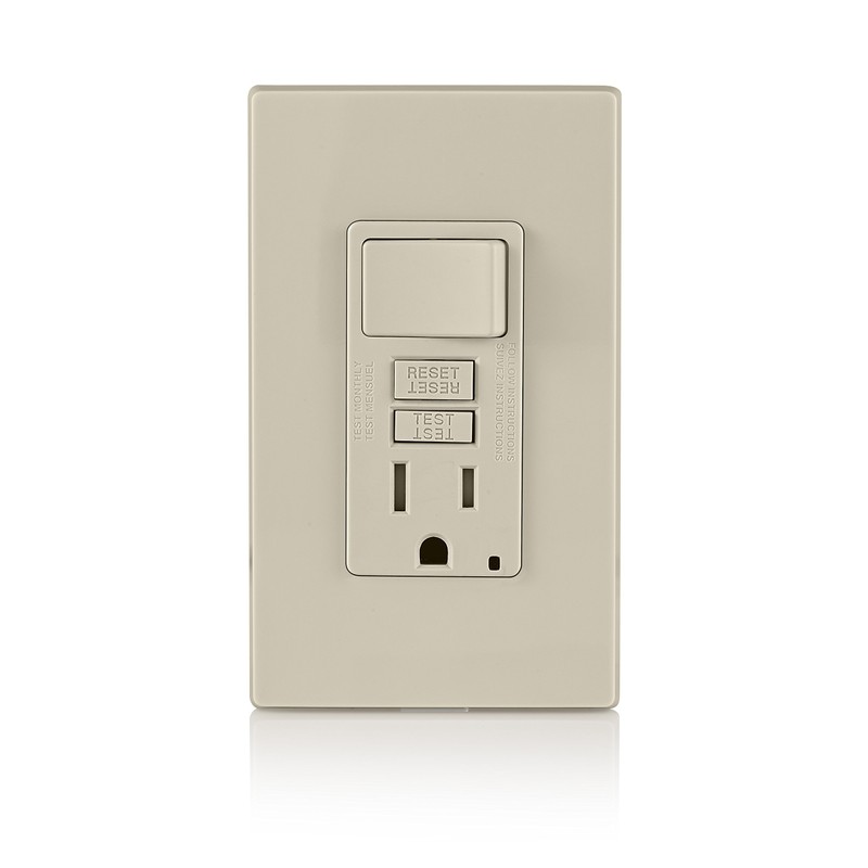 SmartlockPro Slim GFCI Combination Switch. Tamper-Resistant Receptacle with LED Indicator. 15 Amp, 125 Volt. Switch 1800 Watts, 120V AC. Monochromatic, Back and Side Wired, Wallplate/Faceplate Sold Separately, Self-Grounding Clip Included Peace of mind, all the time. The SmartlockPro Self-Test GFCI tests itself even if you forget. Designed to meet the latest UL standard for auto-monitoring (self-test) our complete line of self-test GFCIs periodically conduct an automatic internal test to confirm that it can respond to a ground fault. With the slimmest profile on the market, the device allows for fast and easy installation, while Leviton’s patented reset lockout mechanism prevents reset of the GFCI if it is not wired or operating correctly. The SmartlockPro Self- Test GFCI is the smart choice in ground fault circuit interrupter protection.