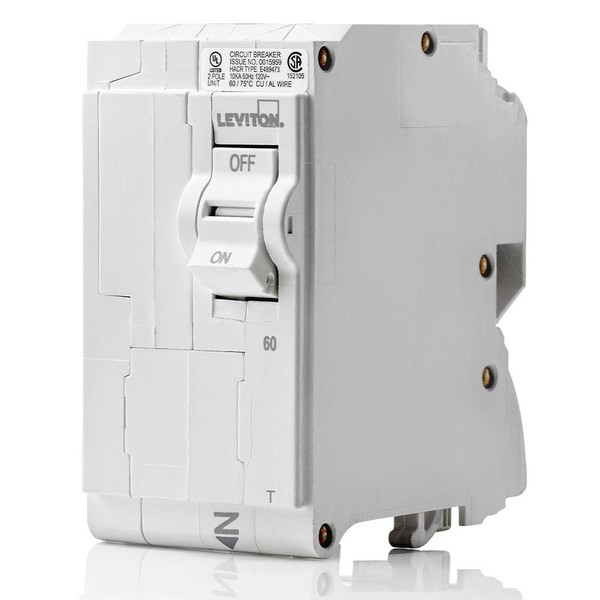 Leviton 60A 2-Pole Plug-On Standard Branch Circuit Breaker, Thermal Magnetic, 120/240 VAC, LB260-T, White