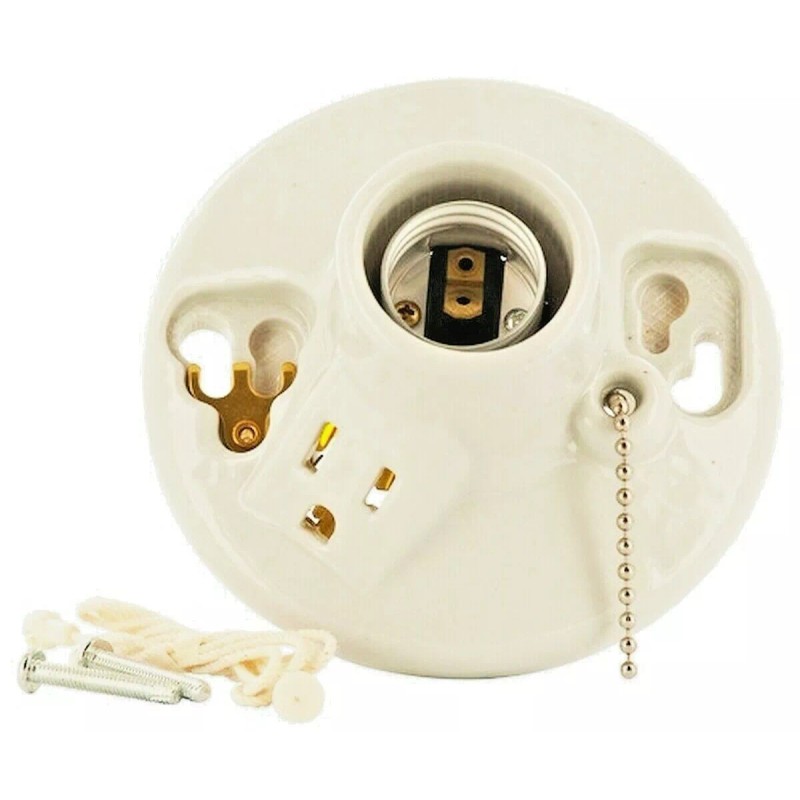 FOR SALE IS ONE (1) NEW WHITE color PORCELAIN (ceramic) MEDIUM BASE COMMERCIAL GRADE LAMPHOLDER FIXTURE WITH PULL CHAIN AND GROUNDED OUTLET BY LEVITON BRAND MPN 9726-C UPC# 078477103098. HIGHEST QUALITY, UL LISTED, GENUINE LEVITON BRAND, TRUE CERAMIC WHICH IS PORCELAIN (just like a white commode), FEATURES 2 TERMINAL SCREWS, SILVER color PULL CHAIN WITH STRING, GROUNDED (3 prong) OUTLET AND MEDIUM SIZE BASE (uses standard classic e26 light bulb), ARCTIC WHITE COLOR PORCELAIN FIXTURE WITH KNOCKOUTS (porcelain is ceramic), THIS LEVITON LAMPHOLDER WITH PULL CHAIN AND GROUNDED OUTLET MOUNTS DIRECTLY TO 3 1/4" or 4" CEILING BOX, TOP WIRED OR MOUNT TO A WALL. DIMENSIONS ARE 4.5" diameter BASE. THE GROUNDED OUTLET IS ALWAYS ON, WORKING INDEPENDENT OF THE PULL CHAIN SWITCH WHICH CONTROLS POWER TO THE BULB ONLY. THIS LEVITON BRAND LAMPHOLDER FIXTURE MAY BE INSTALLED HORIZONTALLY OR VERTICALLY. YOU WILL RECEIVE ONE (1) LEVITON MEDIUM BASE PORCELAIN LAMPHOLDER WITH PULL CHAIN AND GROUNDED OUTLET SHIPPED BY USPS FIRST CLASS MAIL.....