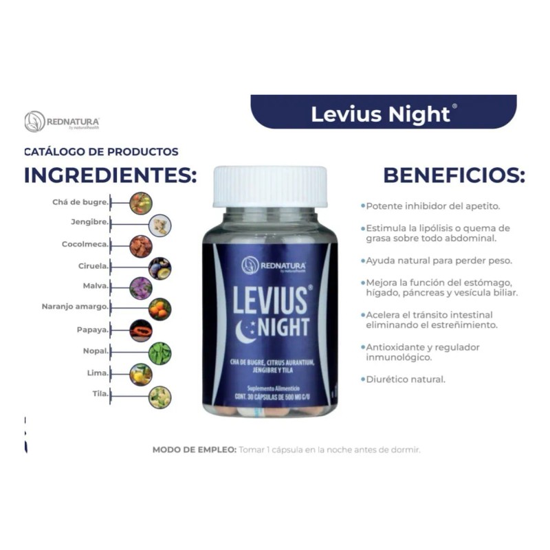 Los ingredientes específicos para Levius Día y Levius Night no están detallados en esta publicación.