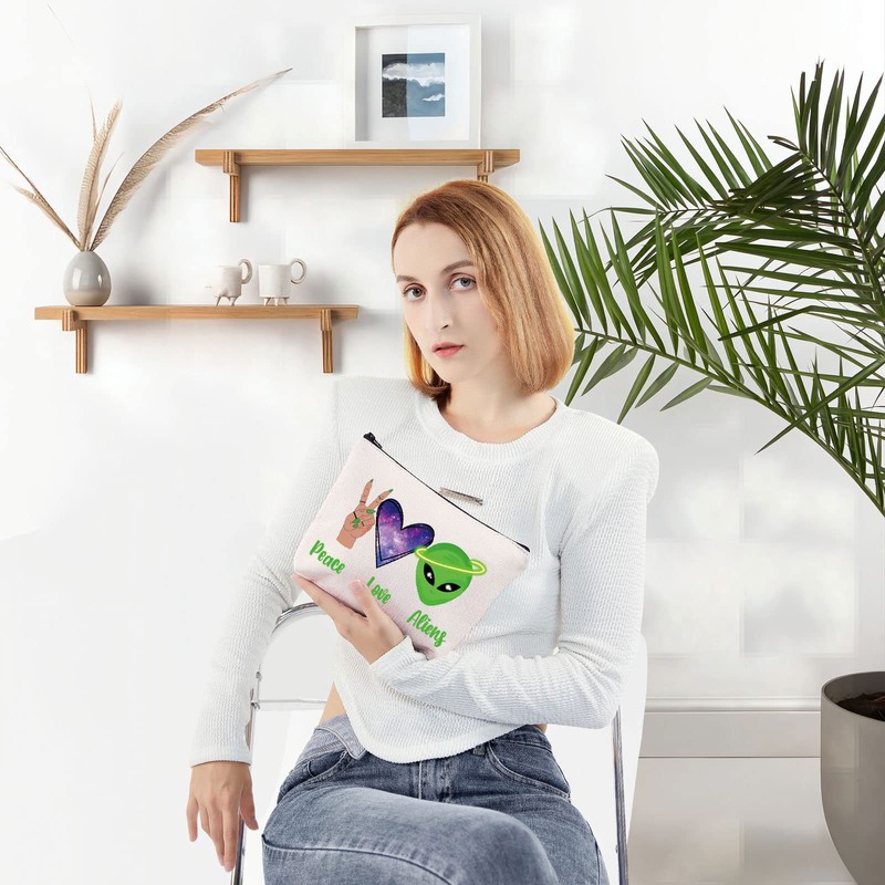 LEVLO Divertida bolsa de cosméticos alienígena, regalo para amantes de los alienígenas, paz, amor, alienígena, maquillaje, bolsa con cierre, regalo de OVNI ET fans, Paz Amor Extranjero