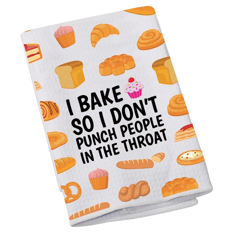- ♥ Towel with saying: "I Bake So I Don't Punch People in The Throat ". Funny words hand towels you can use in Dinning room, kitchen, bathroom and anywhere need wipe your hand.