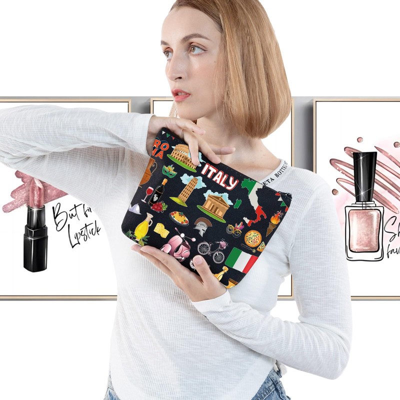 LEVLO Italia - Bolsa de viaje para regalo de recuerdo de Roma, Torre Pisa, Coliseo, Venecia, Carnaval, con cierre, regalo de viaje, Italia Negro, Bolsa de cosméticos