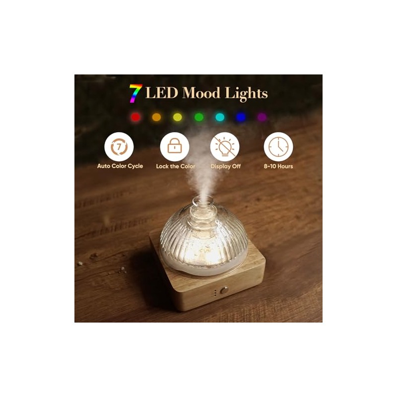 - ROMANTIC MOOD LIGHTLevoair glass essential oil diffuser has 7 soothing colors,set the perfect mood light for you, creating atmosphere, meditation that soothes all your senses. Great night light for young children who scared of dark at bedtime.You can lock your favor color by long prss 5sIf you don't want to be disturbed,long press the buttom after lock color for 5s and then it will turn off the lights.