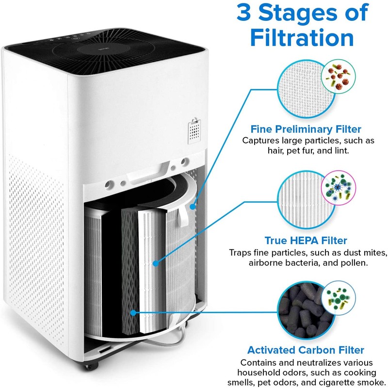 - 3-STAGE FILTRATION: The air purifier uses a High-Efficiency Activated Carbon Filter, True HEPA Filter, and a Fine Preliminary Filter. The True HEPA Filter removes 99.97% of particles as small as 0. 3 microns
